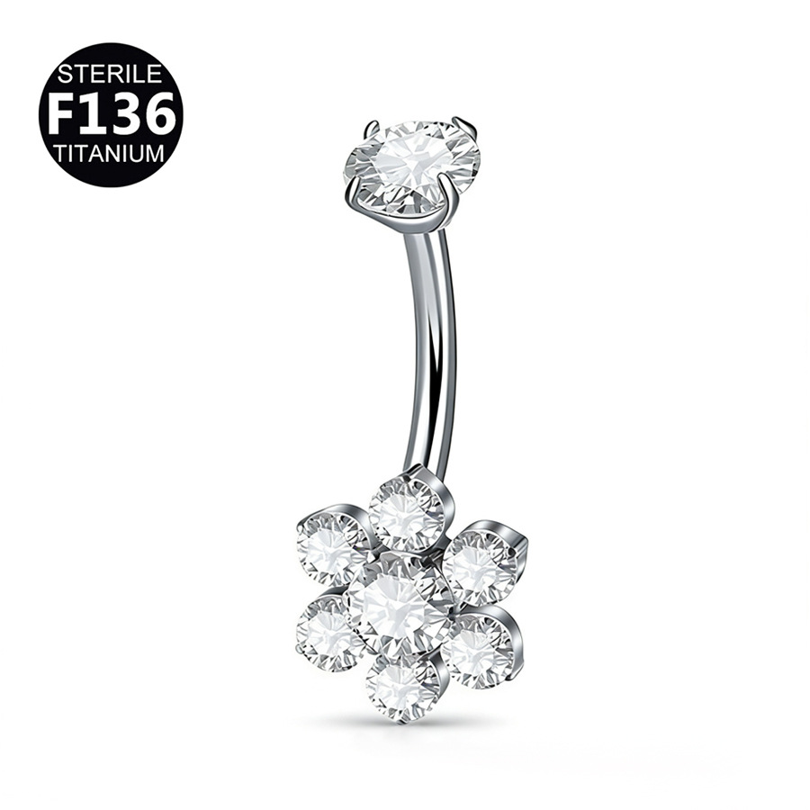 This elegant navel curve features a radiant flower cluster design composed of high-quality round-cut CZ stones for a brilliant floral aesthetic. Engineered from implant-grade titanium, it provides a safe, hypoallergenic, and mirror-polished finish ideal for long-term comfort in Navel (Belly Button) piercings.